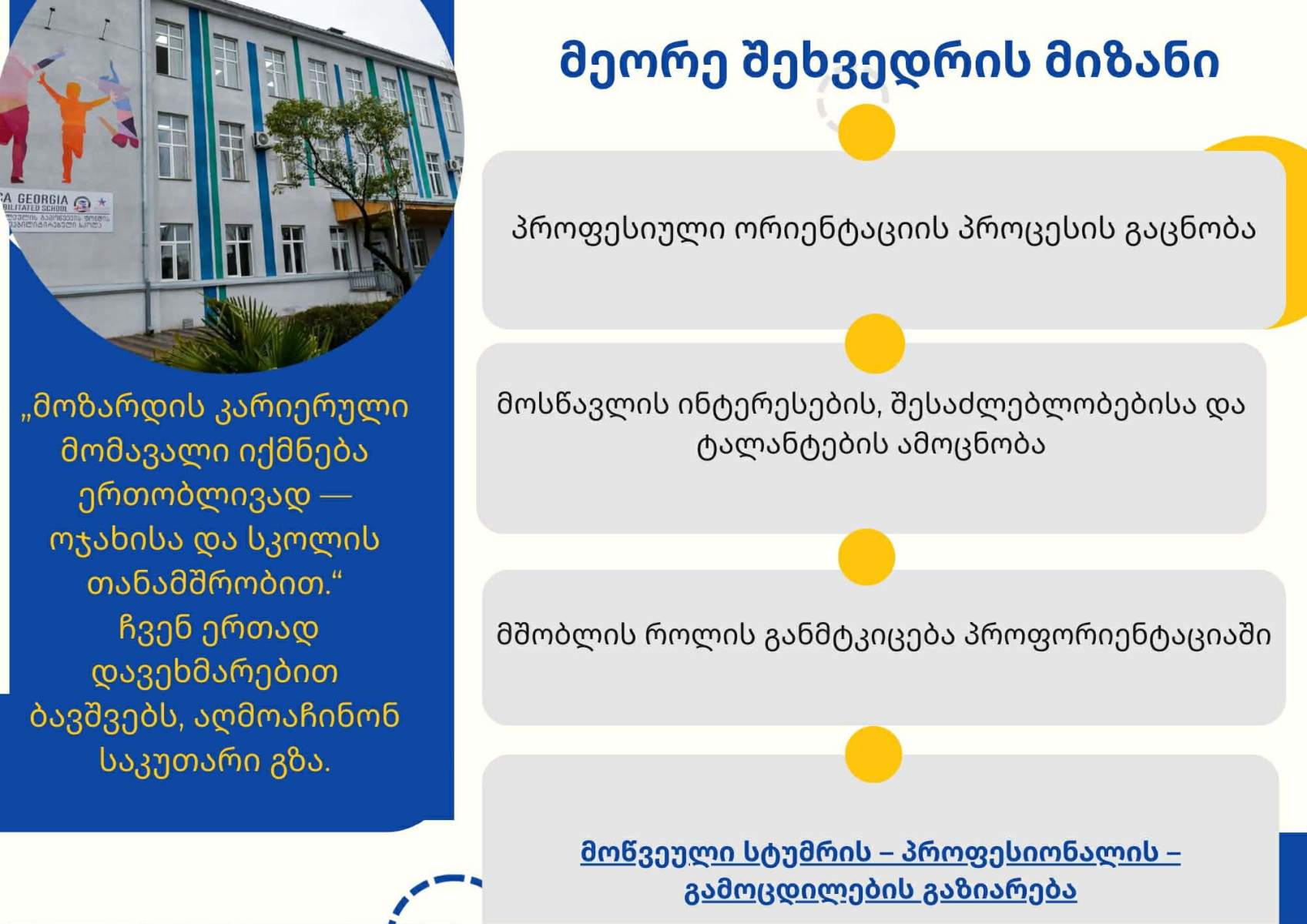ჩვენი მიზანია, ბავშვებს დავეხმაროთ მომავლის სწორად დაგეგმვაში და გავაცნოთ მათ პროფესიული სამყაროს მთელი მრავალფეროვნება.