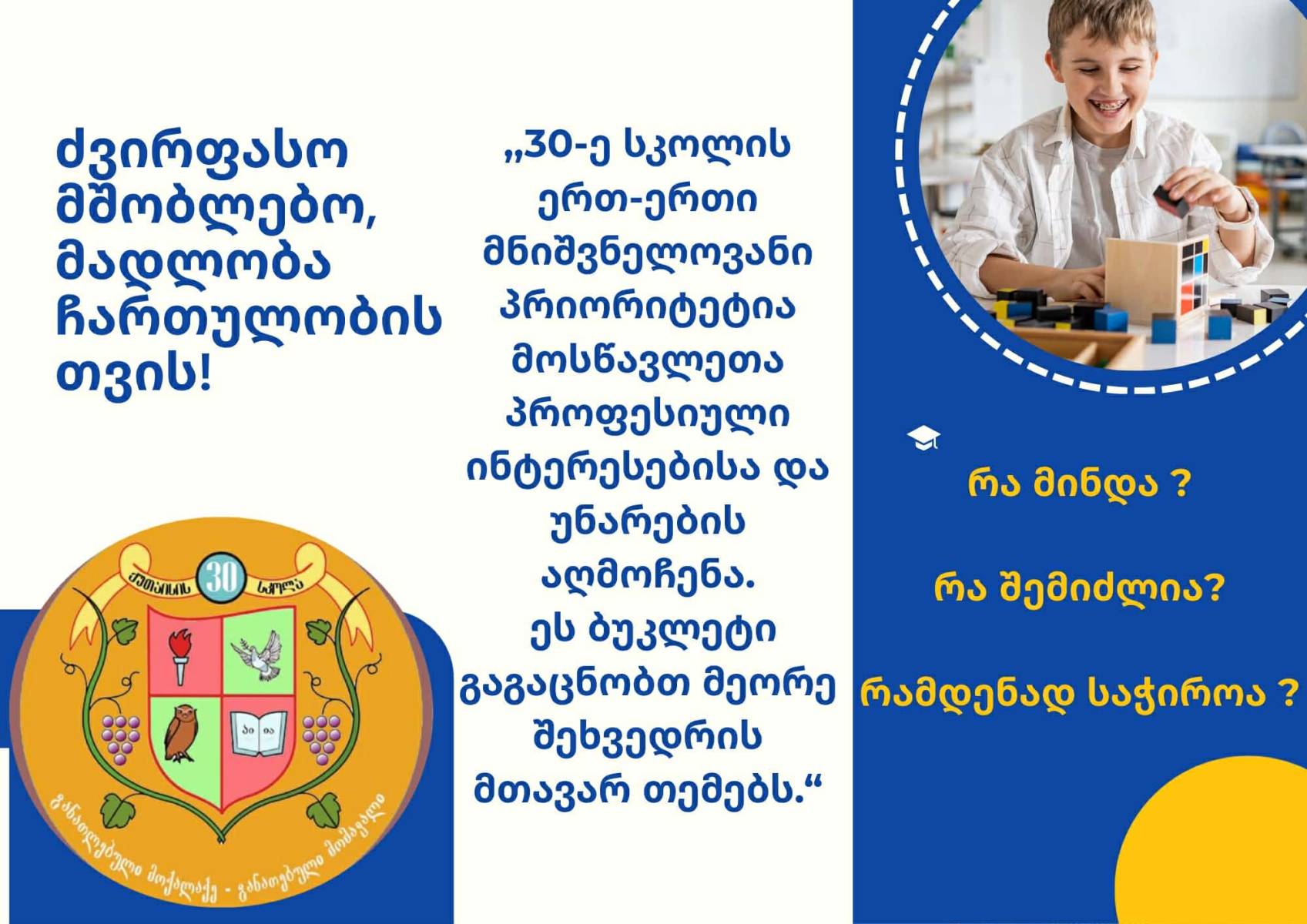 ყურადღება დაეთმობა მოსწავლის ინტერესების, შესაძლებლობებისა და უნარების იდენტიფიცირებას, რათა კიდევ უფრო განმტკიცდეს მშობლის როლი ამ რთულ, მაგრამ საინტერესო პროცესში.